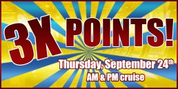 3X PointsJoin us on Thursday, September 24th, because it’s 3X points! Play and earn 3X points on slots! Points can be used for boarding, food and beverage and the gift shop. AM & PM cruise. Book Now! Book Now About Us SIGN-UP FOR EMAIL OFFERS Join our email announcements list for promotions and upcoming events.