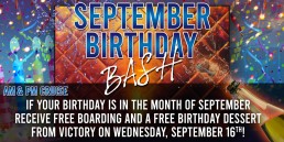 Celebrate your birthday on Victory!If your birthday is in the month of September, come out and celebrate with Victory on Wednesday, September 16th! Birthday presents from Victory include free boarding and a birthday dessert! AM and PM cruise Book Now! Book Now About Us SIGN-UP FOR EMAIL OFFERS Join our email announcements list for promotions and upcoming events.